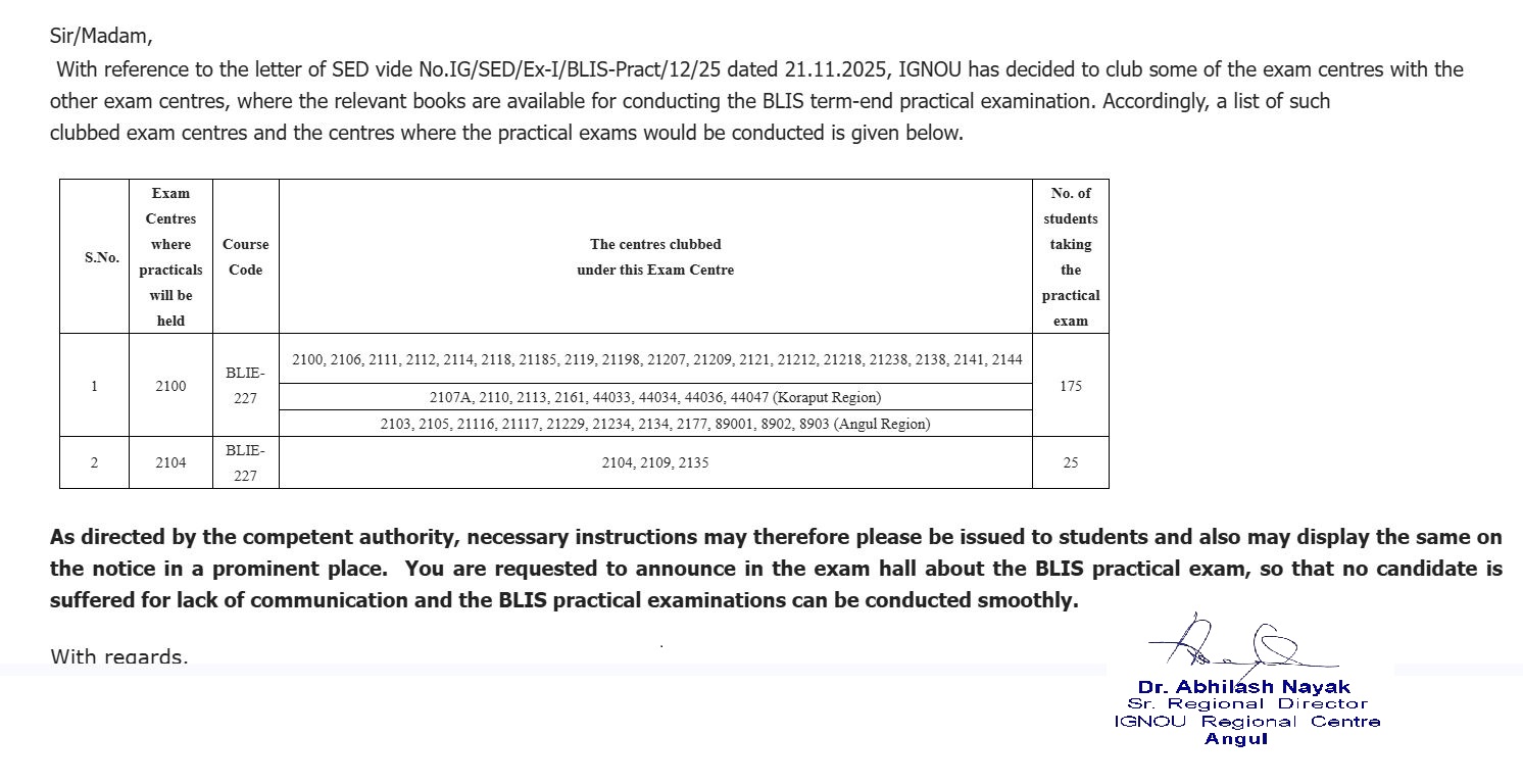 Information Regarding conduct of BLIE-227 (BLIS) Term-end Practical Exam Dec-2025.